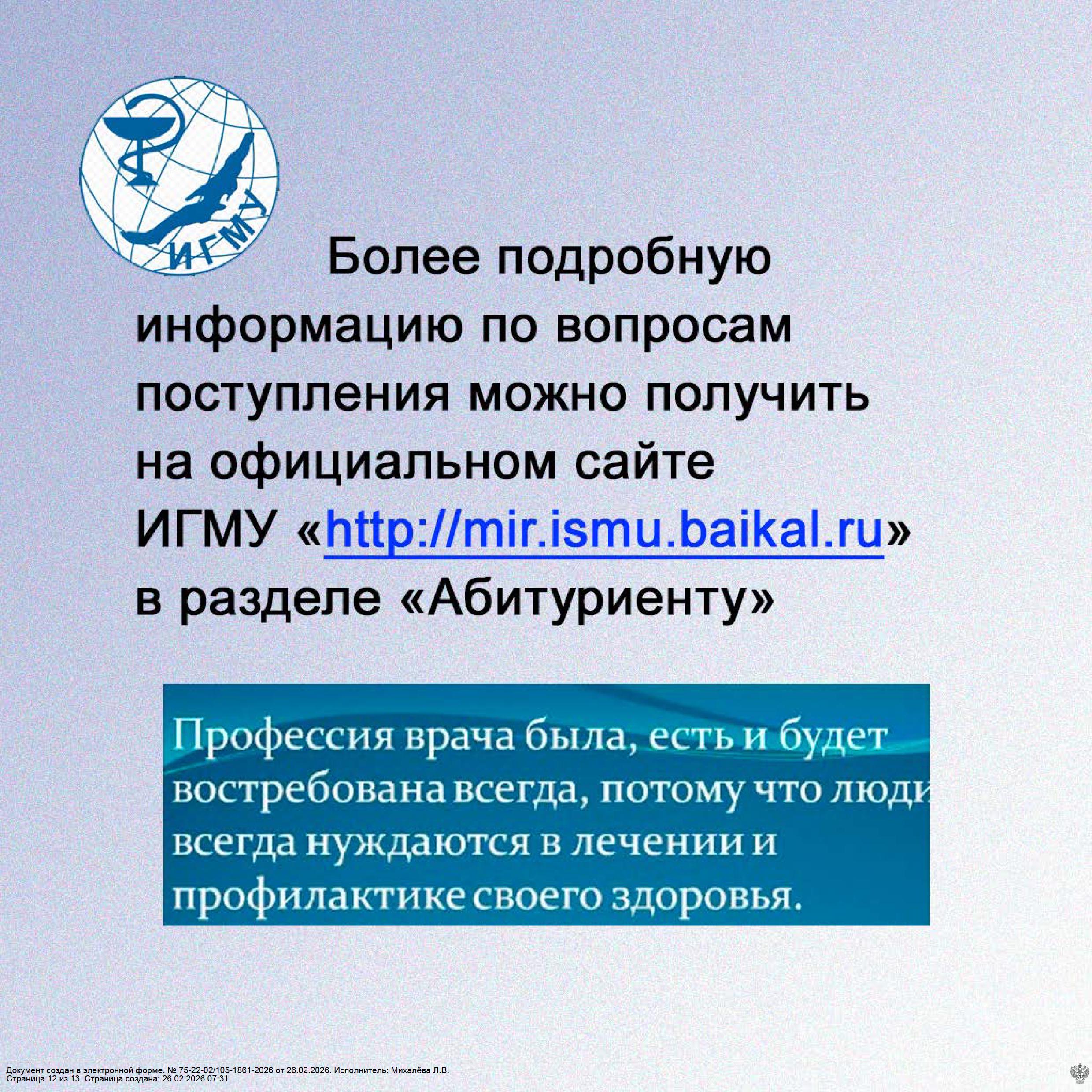 Более подробную информацию по вопросам поступления можно получить на официальном сайте ИГМУ http://mir.ismu.baikal.ru , Раздел «Абитуриенту».