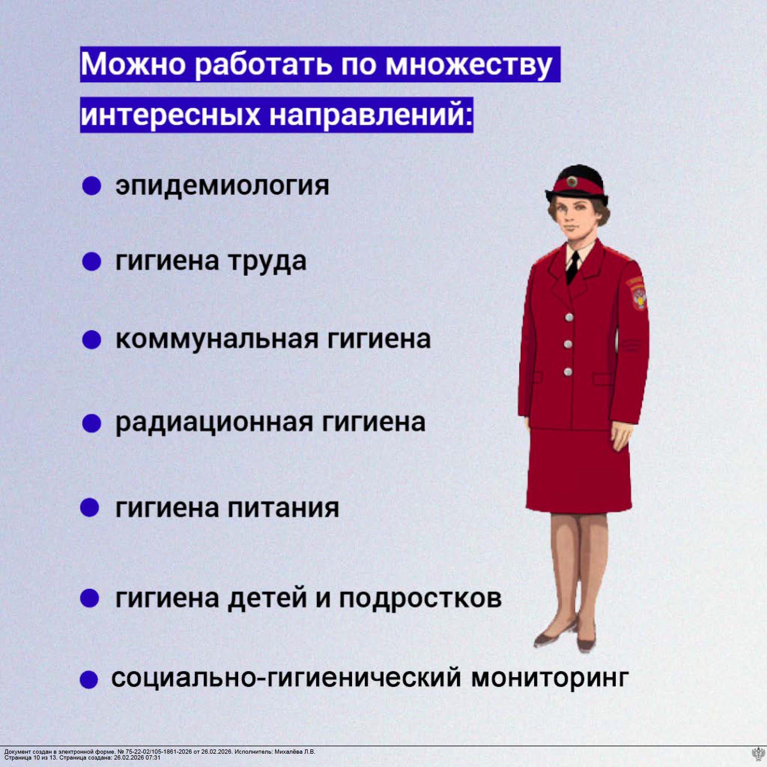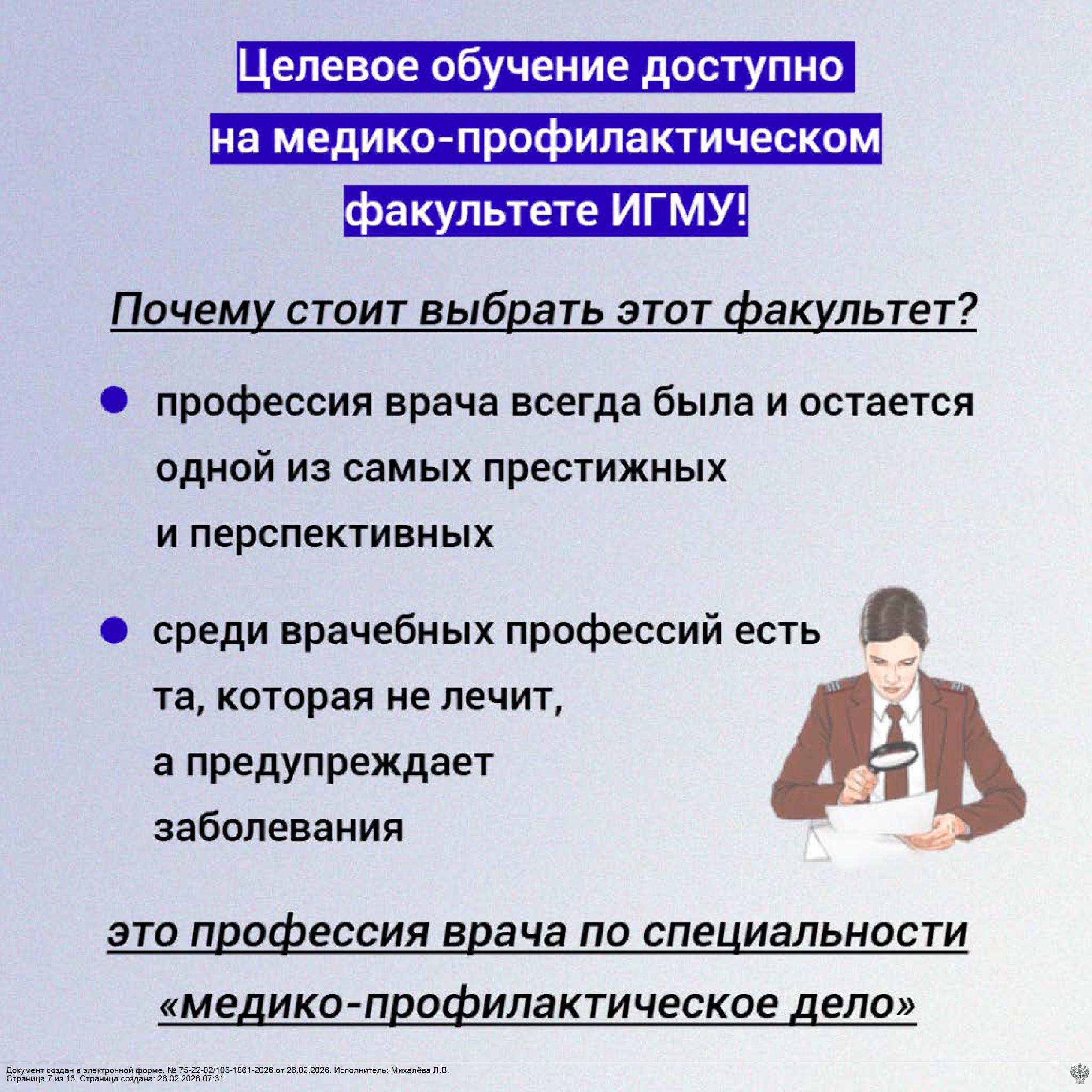 Медико-профилактическое дело - это направление в медицине, основная цель которого не лечение, а предотвращение болезней. Для этого специалисты занимаются профилактикой заболеваний, следят за санитарно- эпидемиологическим благополучием и обеспечивают безопасную среду, необходимую для здоровья населения.
