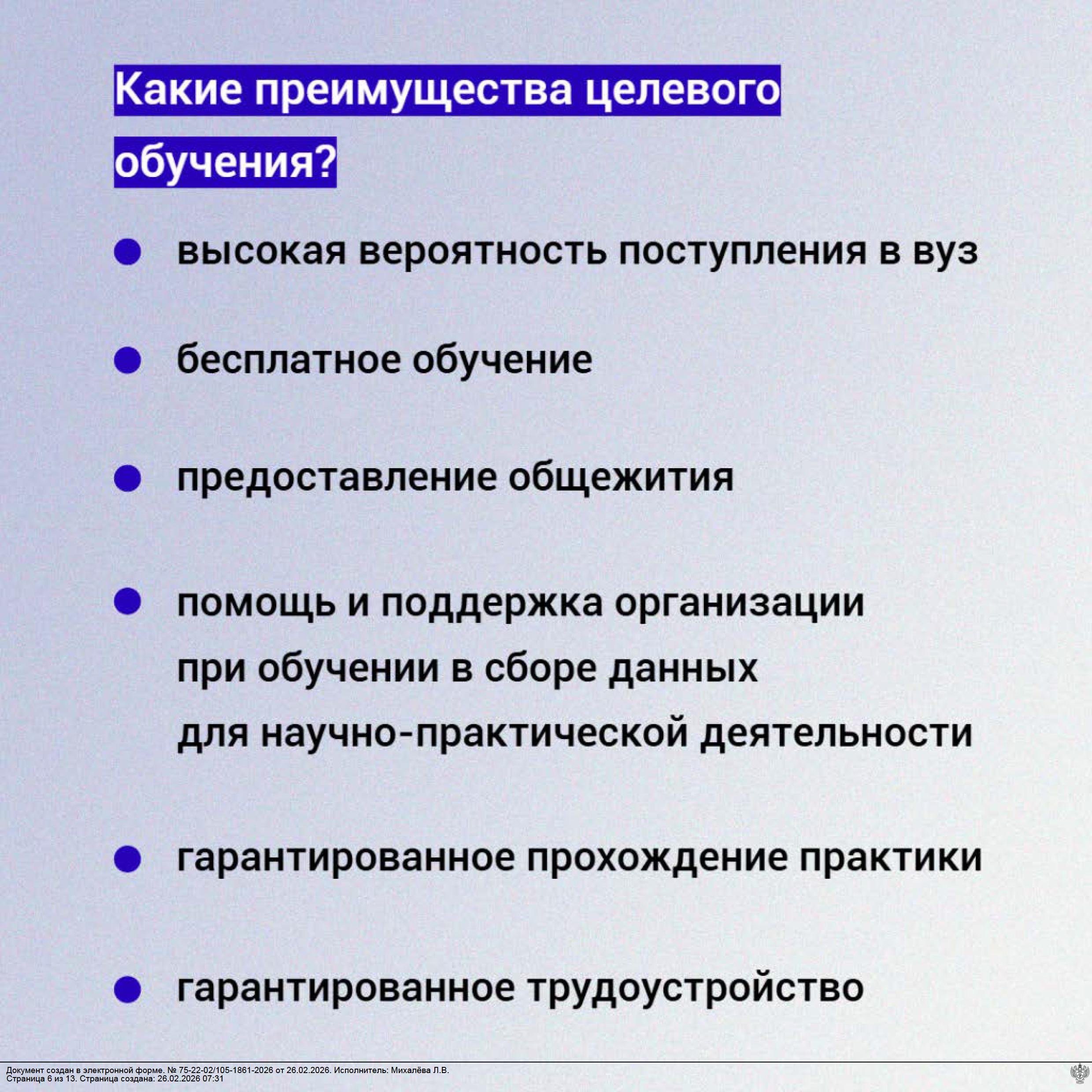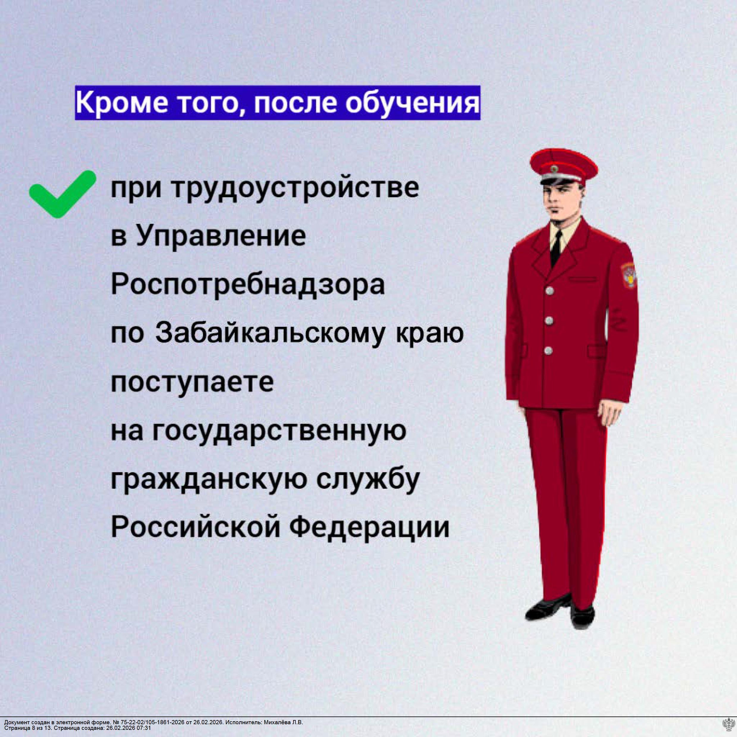 Выпускники медико-профилактического факультета, заключившие с Управлением договоры о целевом обучении, по окончании обучения вне конкурса принимаются на службу в Управление, приобретая статус государственных гражданских служащих.