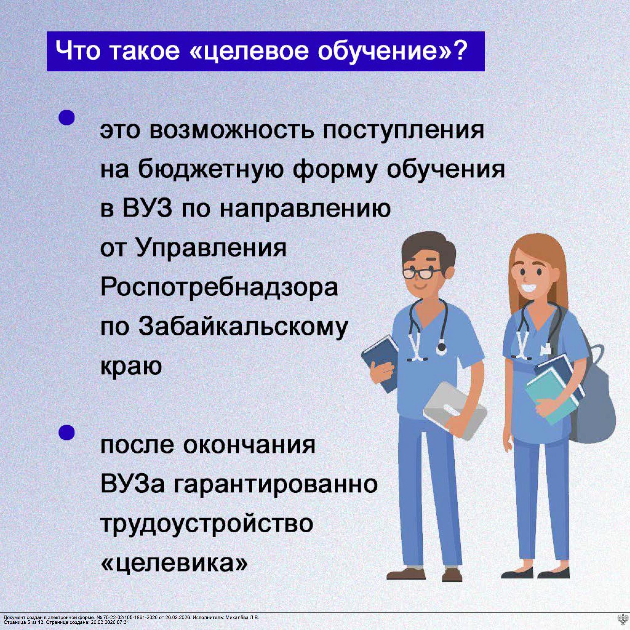 Потребность в целевом обучении на 2026/2027 учебный год для Управления Роспотребнадзора по Забайкальскому краю составляет 2 места.