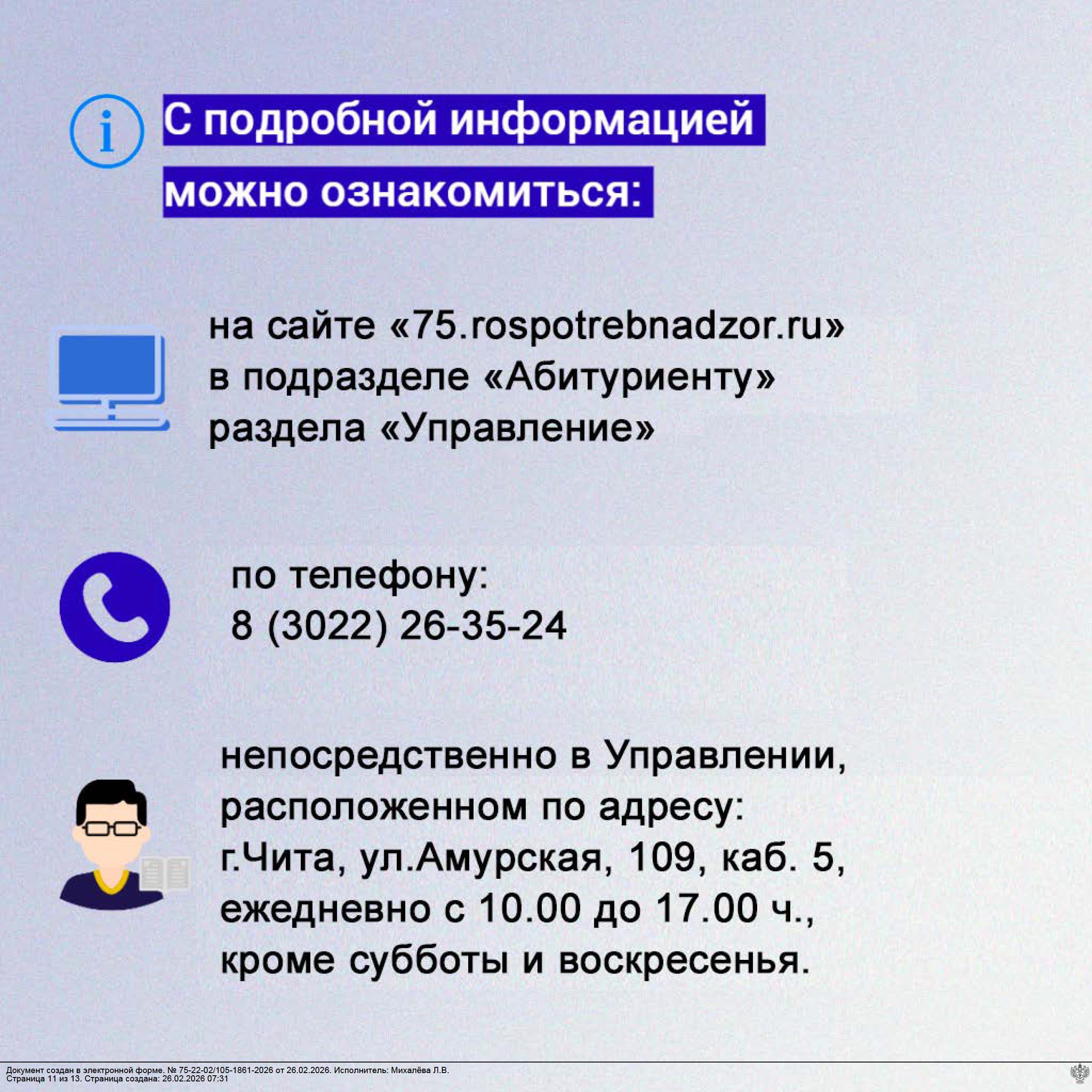 Для получения подробной информации о целевом приеме на медико- профилактический факультет необходимо обратиться в отдел государственной службы, кадров и документационного обеспечения Управления по телефону: 8 (3022) 26-35-24, или непосредственно в Управление, расположенное по адресу: г.Чита, ул.Амурская, 109, ежедневно с 10.00 до 17.00 ч., кроме субботы и воскресенья.