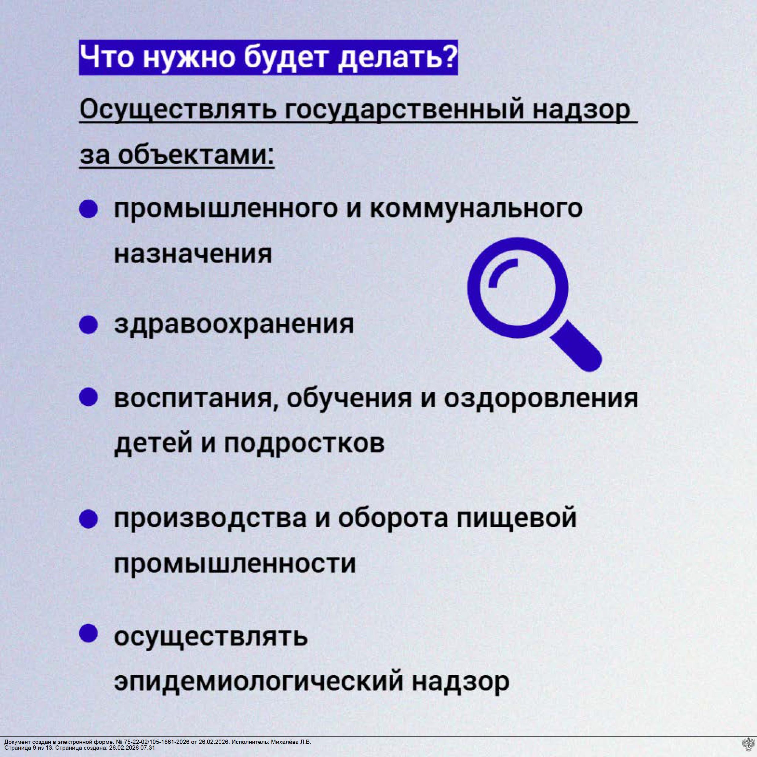 привлечение к административной ответственности лиц за нарушение законодательства Российской Федерации в сфере обеспечения санитарно - эпидемиологического благополучия населения; выполнение научных исследований в области обеспечения санитарно - эпидемиологического благополучия населения.