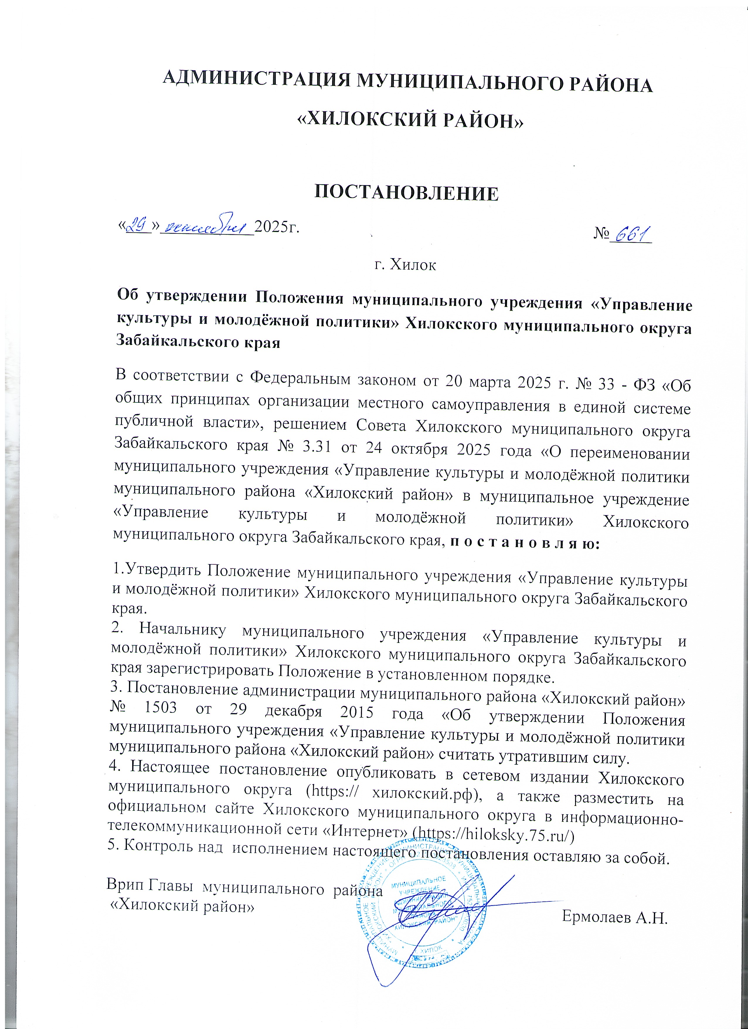 03.11.2025: Постановление Хилокского муниципального округа №661 от 29.10.2025г. "Об утверждении Положения муниципального учреждения «Управление культуры и молодёжной политики» Хилокского муниципального округа Забайкальского края"